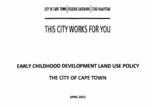 Ce document d’orientation vise à garantir une approche cohérente des centres de développement de la petite enfance (grands ou petits) lors de l’évaluation des demandes d’aménagement du territoire dans la ville du Cap. L’objectif est de promouvoir et de sauvegarder l’agrément et la qualité de l’environnement des zones locales où sont situés les centres de développement de la petite enfance.