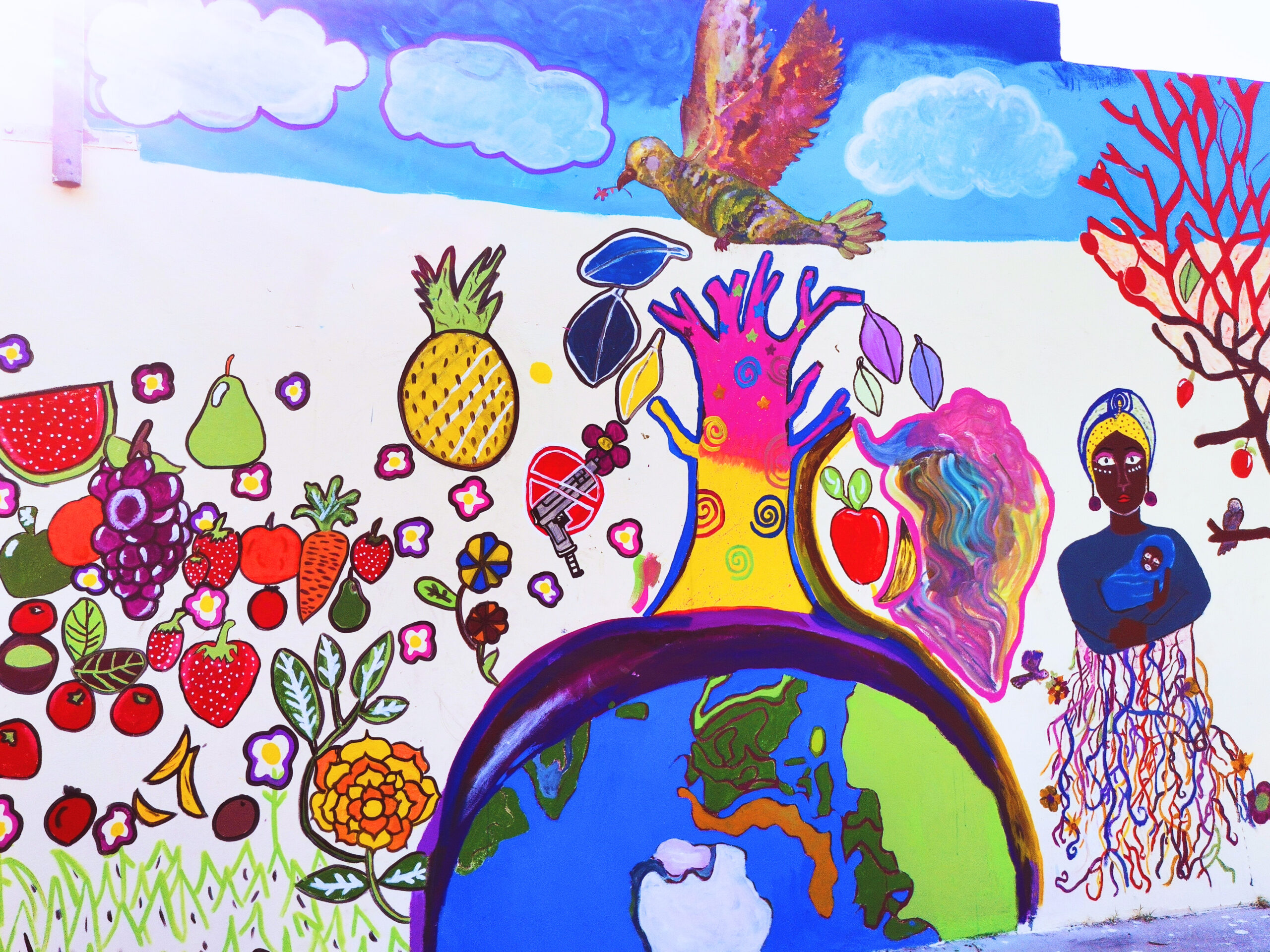 What makes this mural particularly compelling is the fact that the design process, which culminated in a series of workshops, was structured around and led entirely by children from the school, with support and guidance from SabaZahara HoneyBush, Community Arts Facilitator and Creative Director of HoneyBush Healing Arts Platform. This approach honours their voices, experiences and imaginations, ensuring the message is authentic, relatable and empowering. This powerful youth-led arts intervention promotes food security, peace-building and positive alternatives to gang violence.