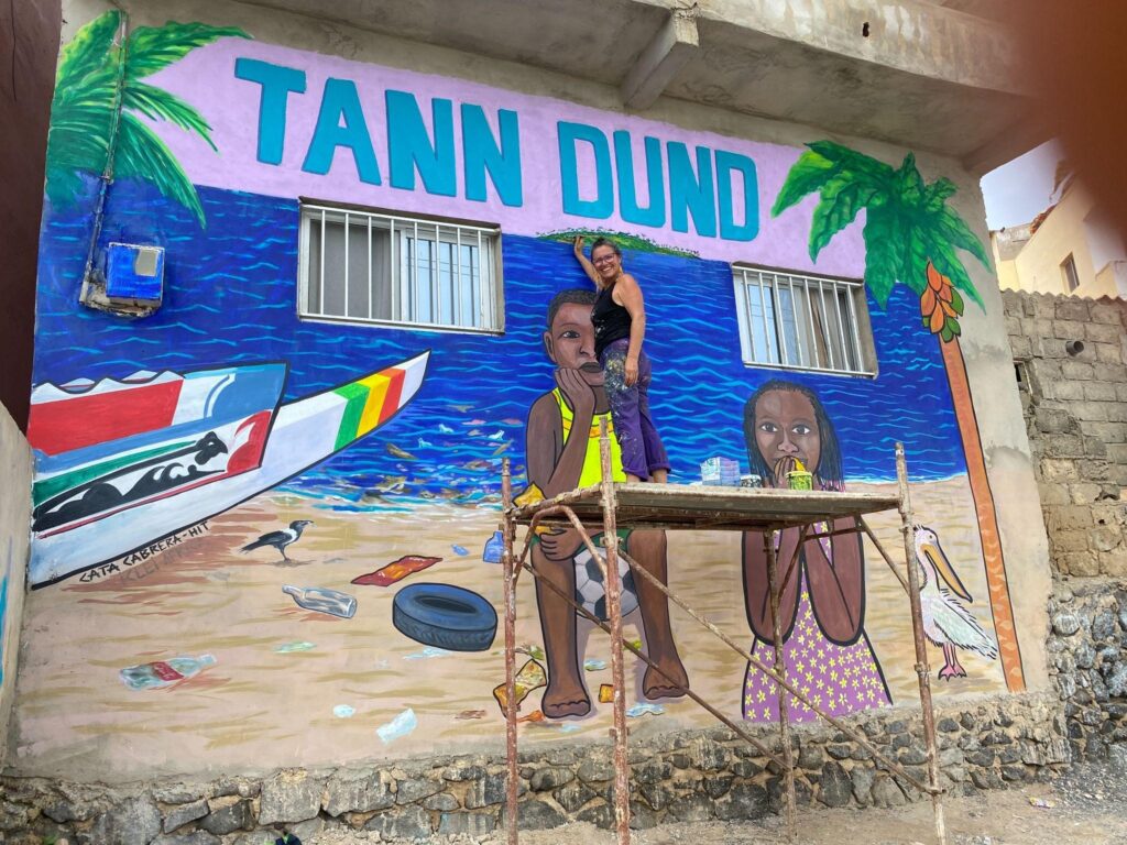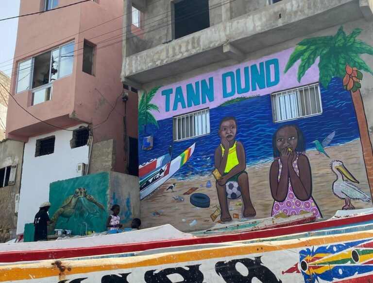 The seaside backdrop is intentional. Ngor’s beaches and sea are increasingly contaminated by household waste. The contrast between the two children in this mural highlights the interconnectedness of environmental stewardship and food choices, recognising that the health of people and the planet are deeply intertwined. It raises awareness about the growing challenge of ultra-processed foods, environmental degradation associated with consumption and waste and the preservation of nourishing food systems rooted in local production and environmental care.