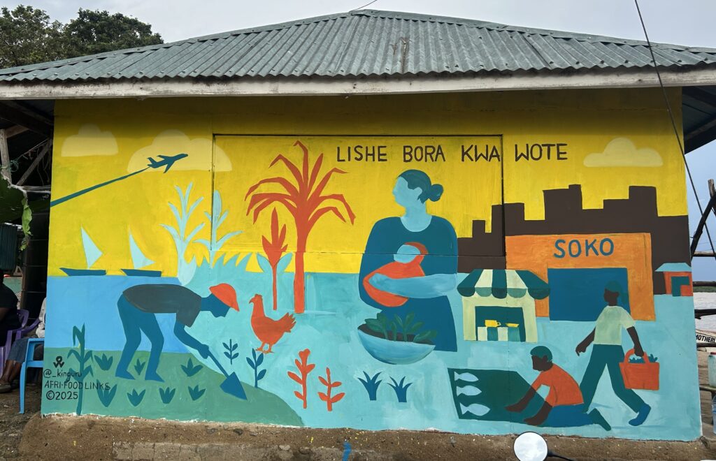 The mural, located at the Dunga Eco Craft Community Shop on Dunga Beach, next to the fish market in Kisumu and near the lake, features the Swahili phrase “lishe bora ka wote,” meaning “nutrition for all”. This message reinforces the mural’s focus on equitable access to healthy food and connects viewers to Kisumu’s local food production, markets and nutrition opportunities.